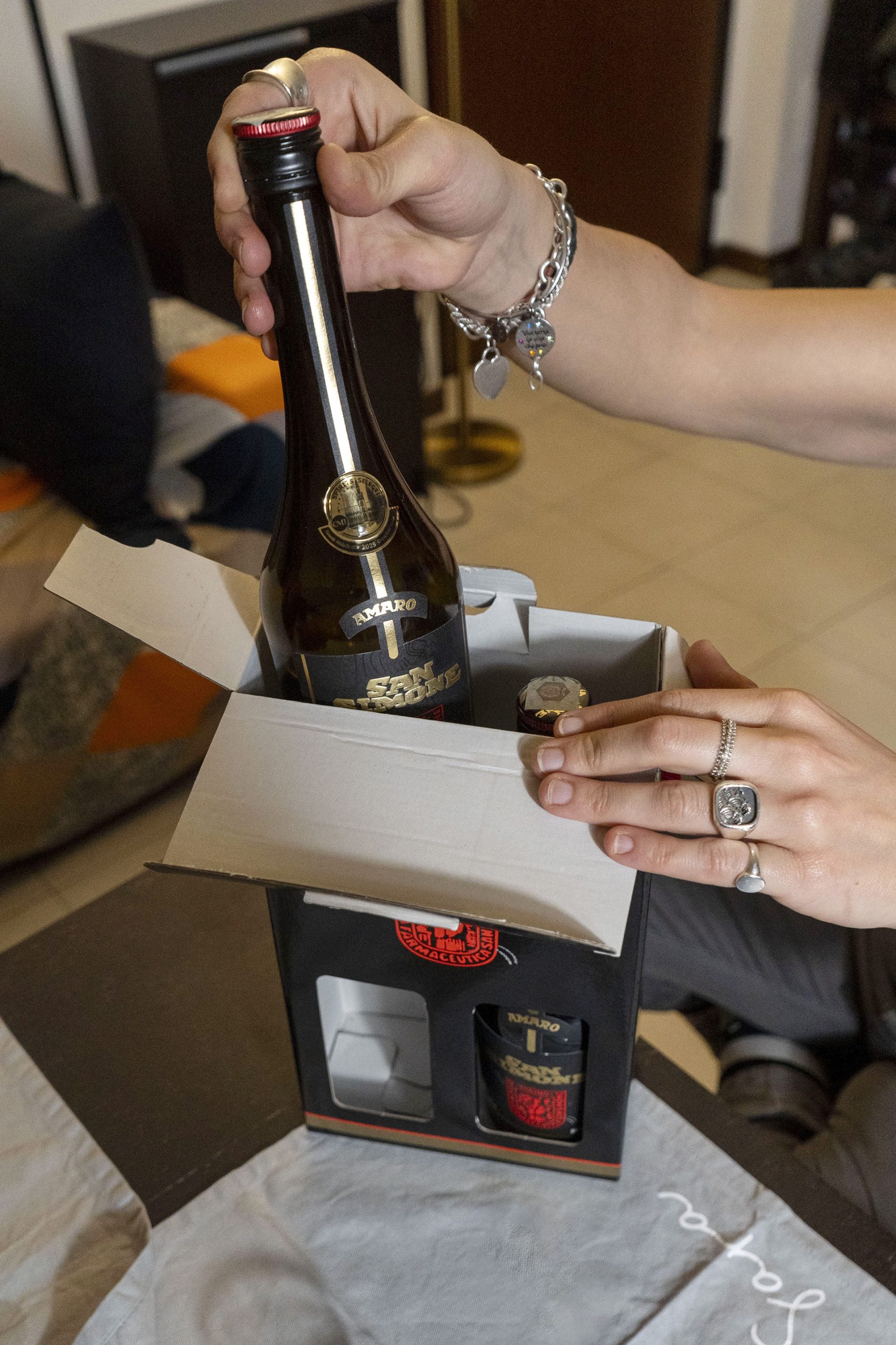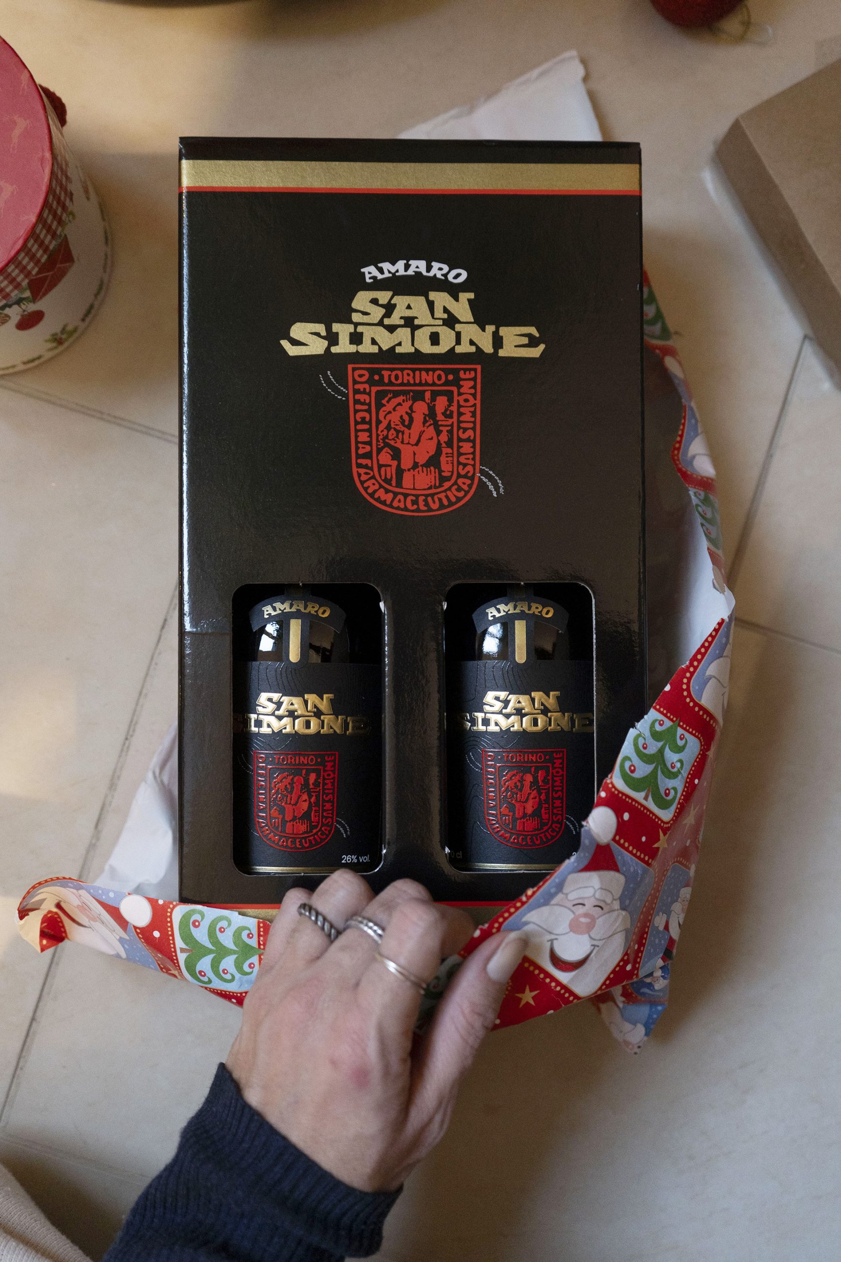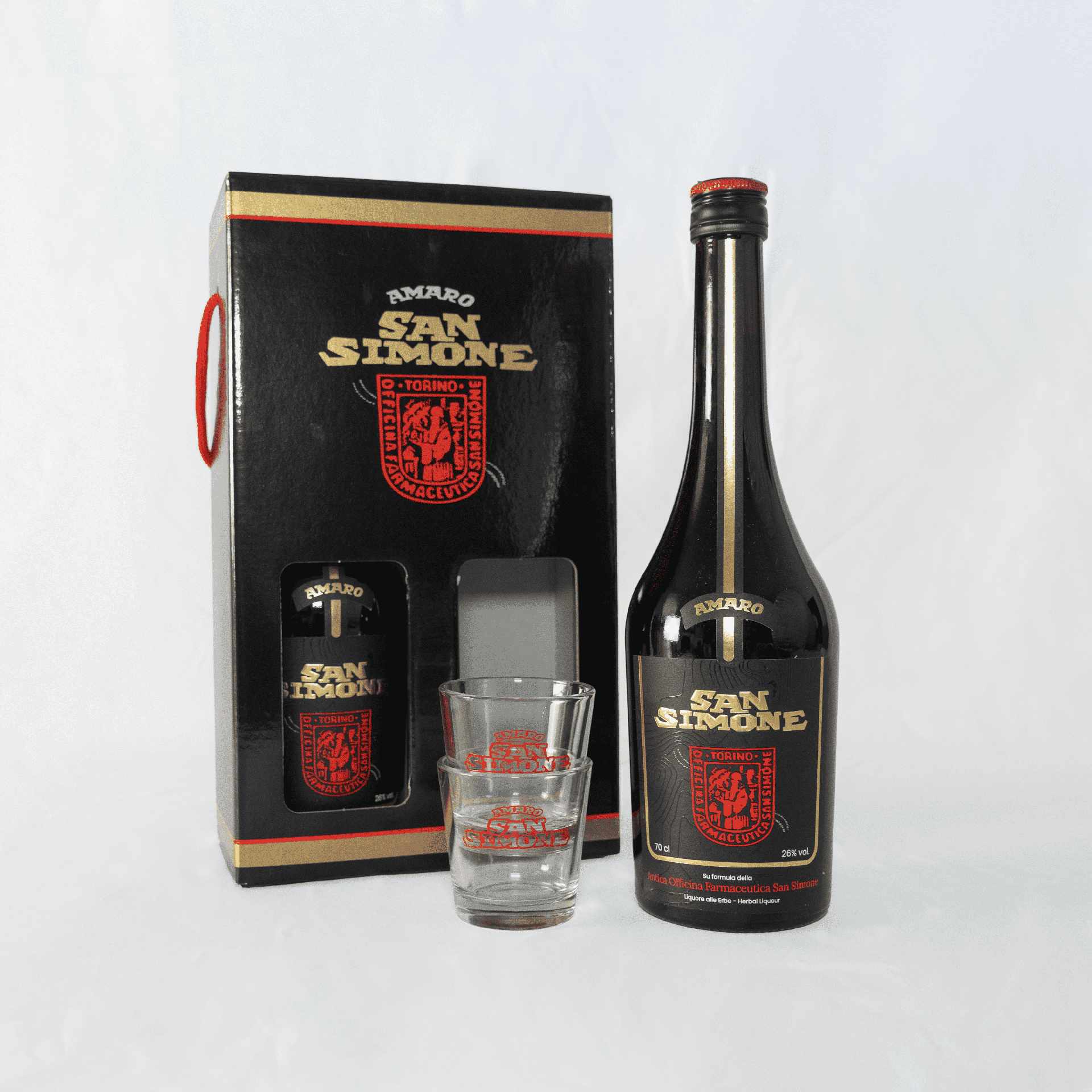 Una raffinata confezione con 2 bottiglie 70 cl e 2 bicchierini serigrafati a mano Amaro San Simone.